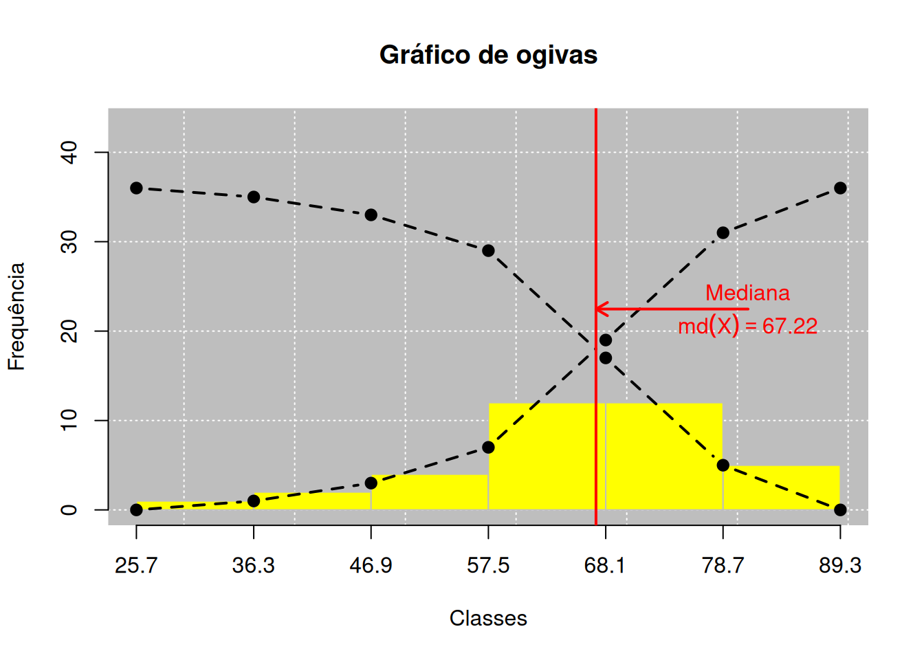 \[ \begin{align} \hat{F}_X(x^*) = 1 - \hat{F}_X(x^*), \end{align} \tag{2.15}\] sendo que o primeiro termo antes da igualdade representa a abscisa da ogiva crescente, e o segundo termo, a abscissa da ogiva decrescente. Podemos observar que a expressão (2.15) pode ser simplificada por: