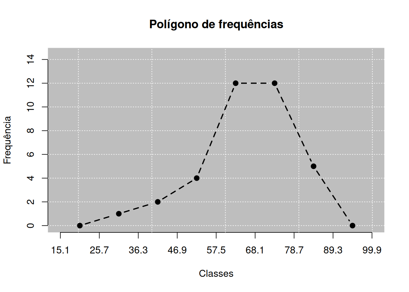 O polígono de frequências consiste em observar o histograma de frequência e representar os pontos médios das classes por meio de um ponto, elevando-os a altura das barras. Posteriormente, une-as por uma linha.