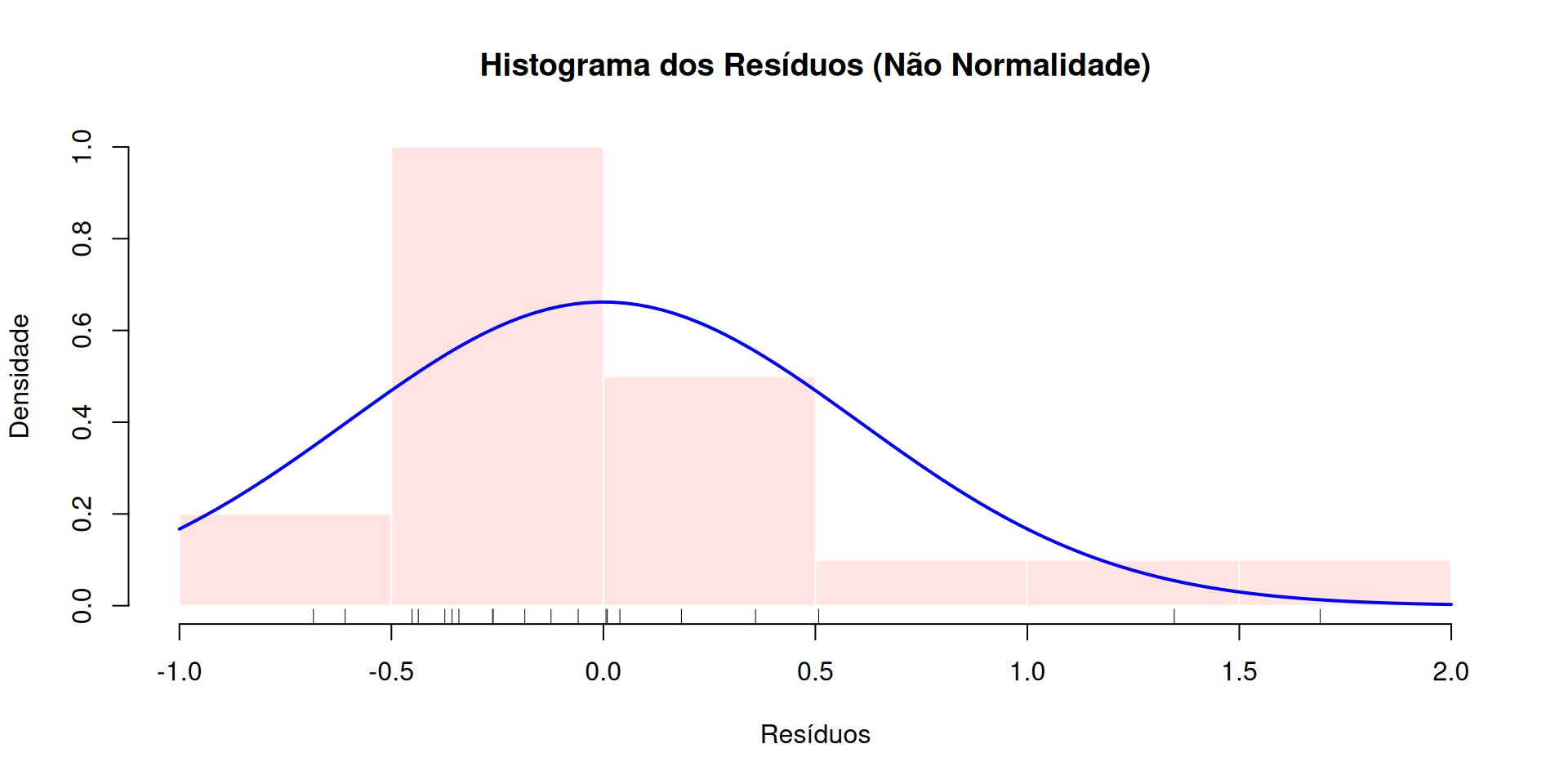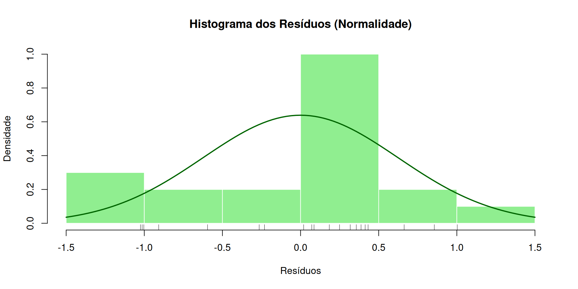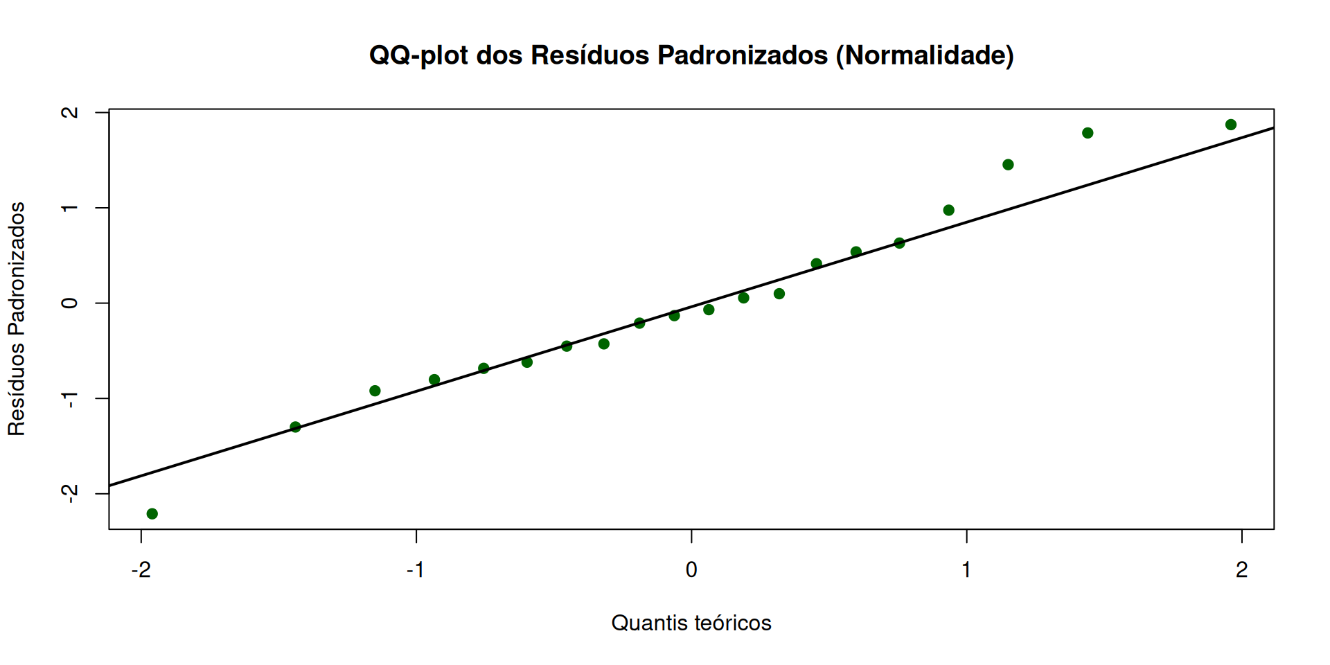shapiro.test(residuos)ad.test(residuos) (pacote nortest)lillie.test(residuos) (pacote nortest)jarque.bera.test(residuos) (pacote tseries)bartlett.test(resposta ~ tratamento)leveneTest(resposta ~ tratamento) (pacote car)fligner.test(resposta ~ tratamento)durbinWatsonTest(modelo) (pacote car ou lmtest)# Se necessário, instale
