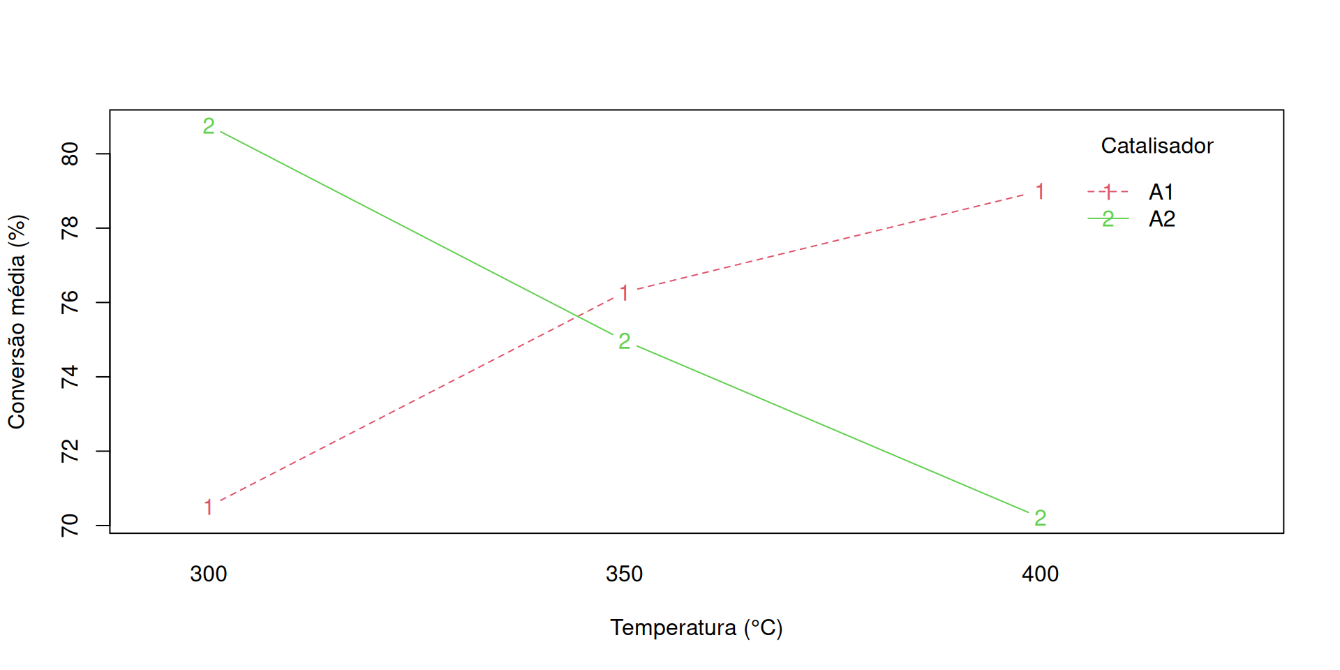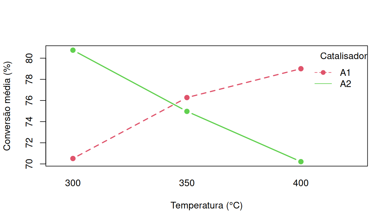Objetivo: Avaliar a eficiência de dois catalisadores (fator A) sob três níveis de temperatura (fator B), visando identificar quais combinações promovem maior conversão do reagente em produto em um processo químico.