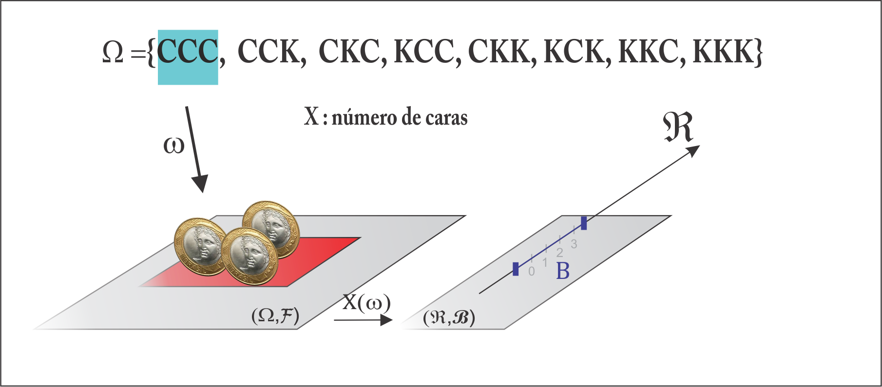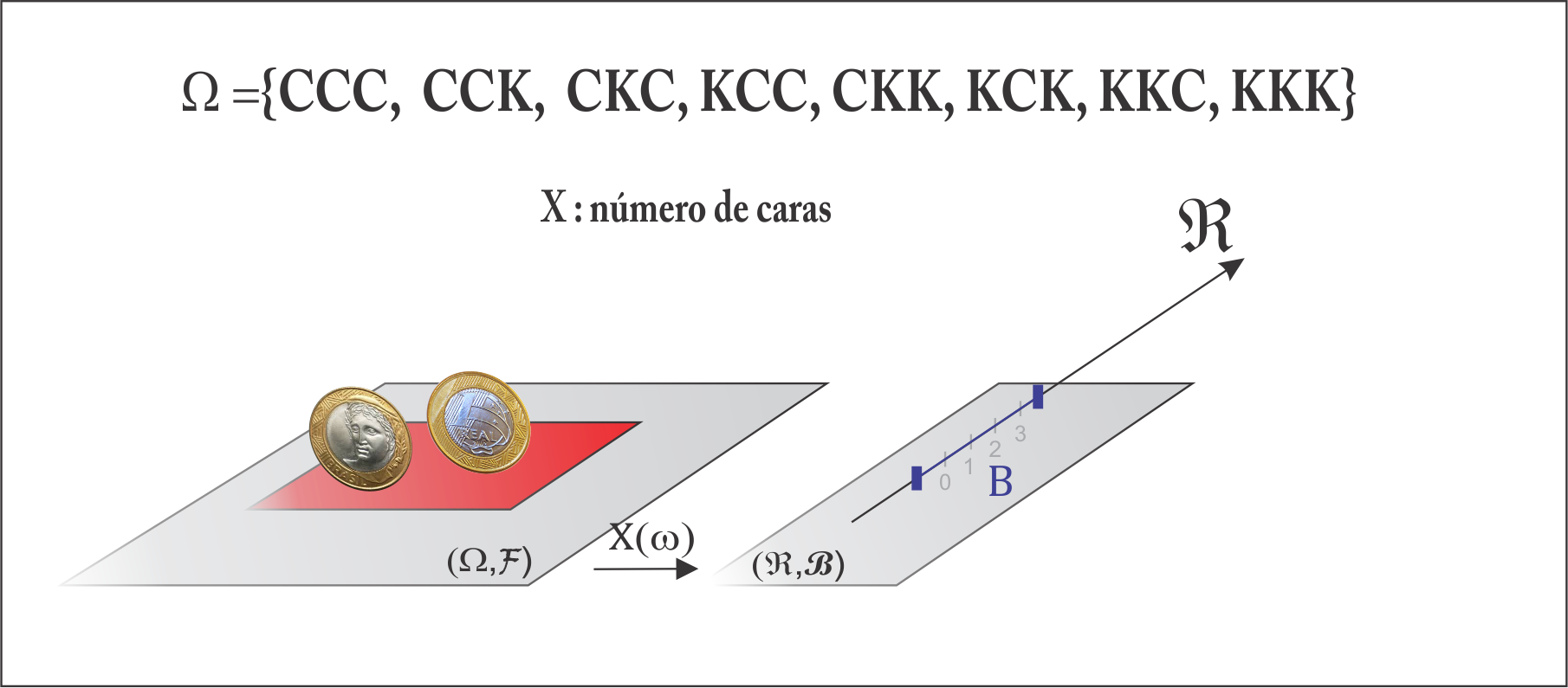 Definição (Variável Aleatória): Seja o espaço amostral \(\Omega\) de um experimento, então uma função \(X: \Omega \to \mathbb{R}\) é chamada de variável aleatória, isto é, considerando \(\omega \in \Omega\), então a variável aleatória, \(X(\omega)\), é uma função com domínio em \(\Omega\) e imagem no conjunto dos reais \(B\), tal que \(B = \{x \in \mathbb{R}: X(\omega) = x,~\omega \in \Omega\}\).