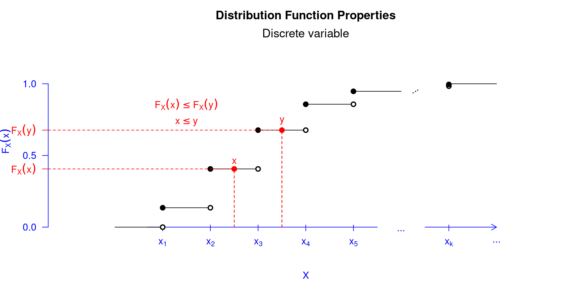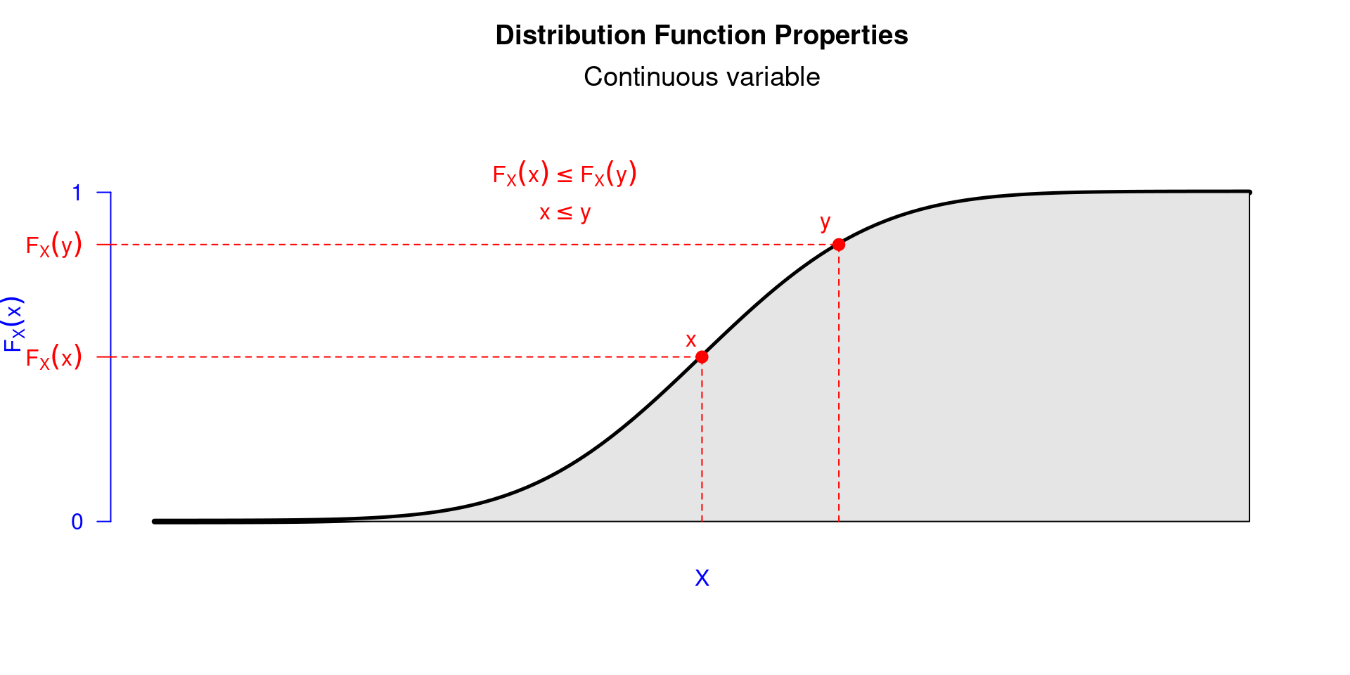 - \(F_X(x)\) é uma função não decrescente, isto é, \(F_X(x)\leq F_X(y)\) sempre que \(x\leq y\), \(\forall x,y \in \mathbb{R}\);