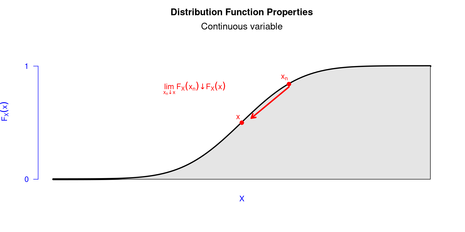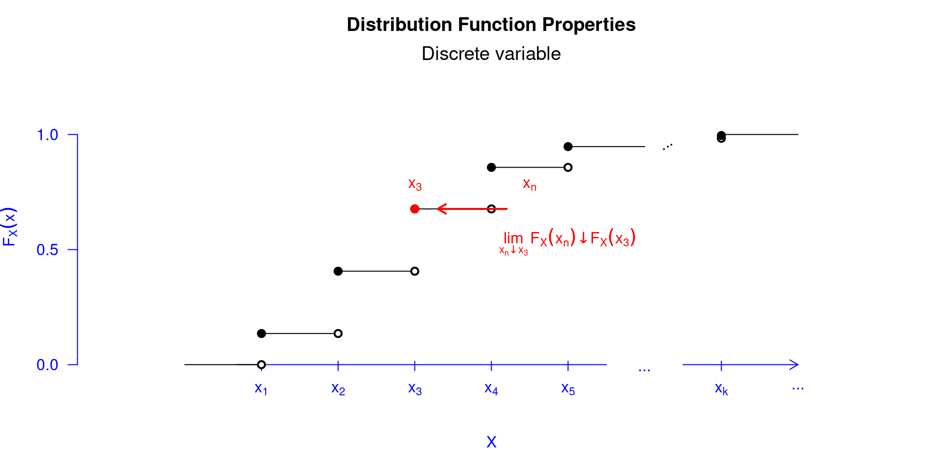 - \(F_X(x)\) é contínua à direita, ou seja, para um número \(x\), \(\lim_{x_n\downarrow x}F_X(x_n)\downarrow F_X(x)\).