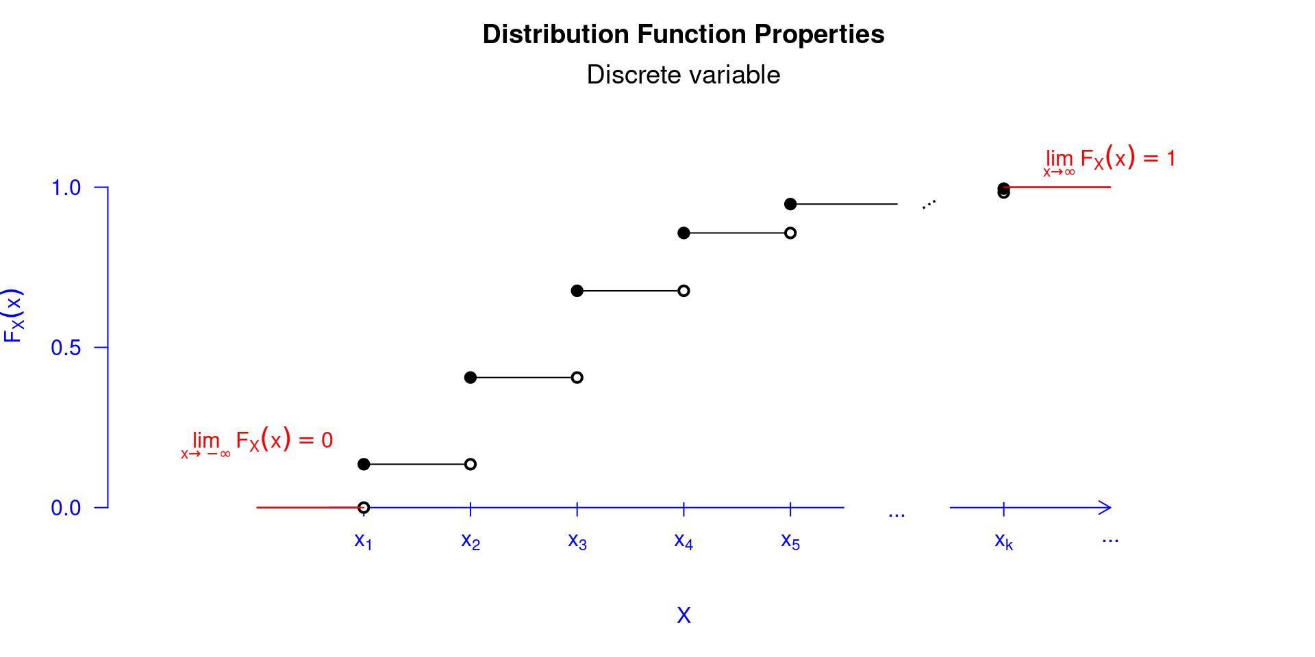 - \(\lim_{x\rightarrow\infty}F_X(x)=1\) e \(\lim_{x\rightarrow -\infty}F_X(x)=0\);