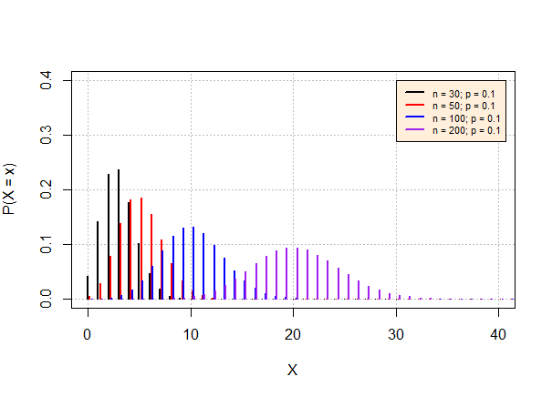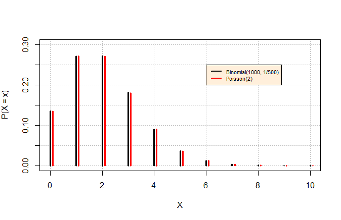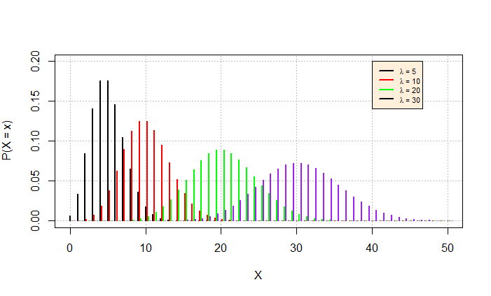 Uma variável aleatória \(X\) discreta, tem distribuição Poisson , se sua função de probabilidade é dada por \[\begin{eqnarray}\label{eq:distpoisson} P(X=x)=\left\lbrace \begin{array}{ll} \frac{e^{-\lambda}\lambda^{x}}{x!},& \textrm{ para } x= 0,1,2,\ldots,\\ 0,& \textrm{caso contrário}, \end{array}\right. \end{eqnarray}\] em que \(\lambda>0\). Em notação, \(X \sim Poisson(\lambda)\) representa que \(X\) tem distribuição Poisson com parâmetro \(\lambda\).