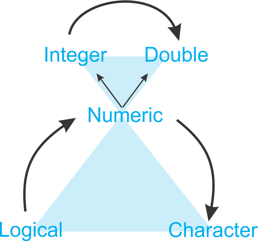numeric (integer ou double), character, complex, logical, raw, expression, function |
