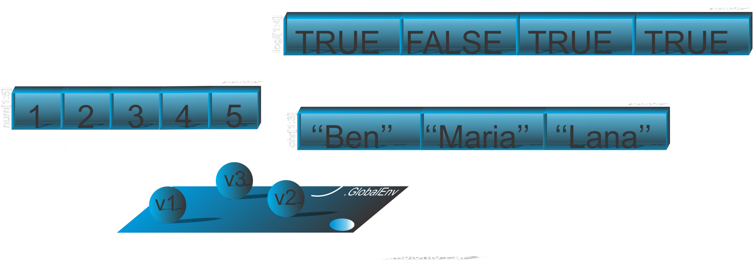 | Vetor | numeric (integer ou double), character, complex, logical, raw |