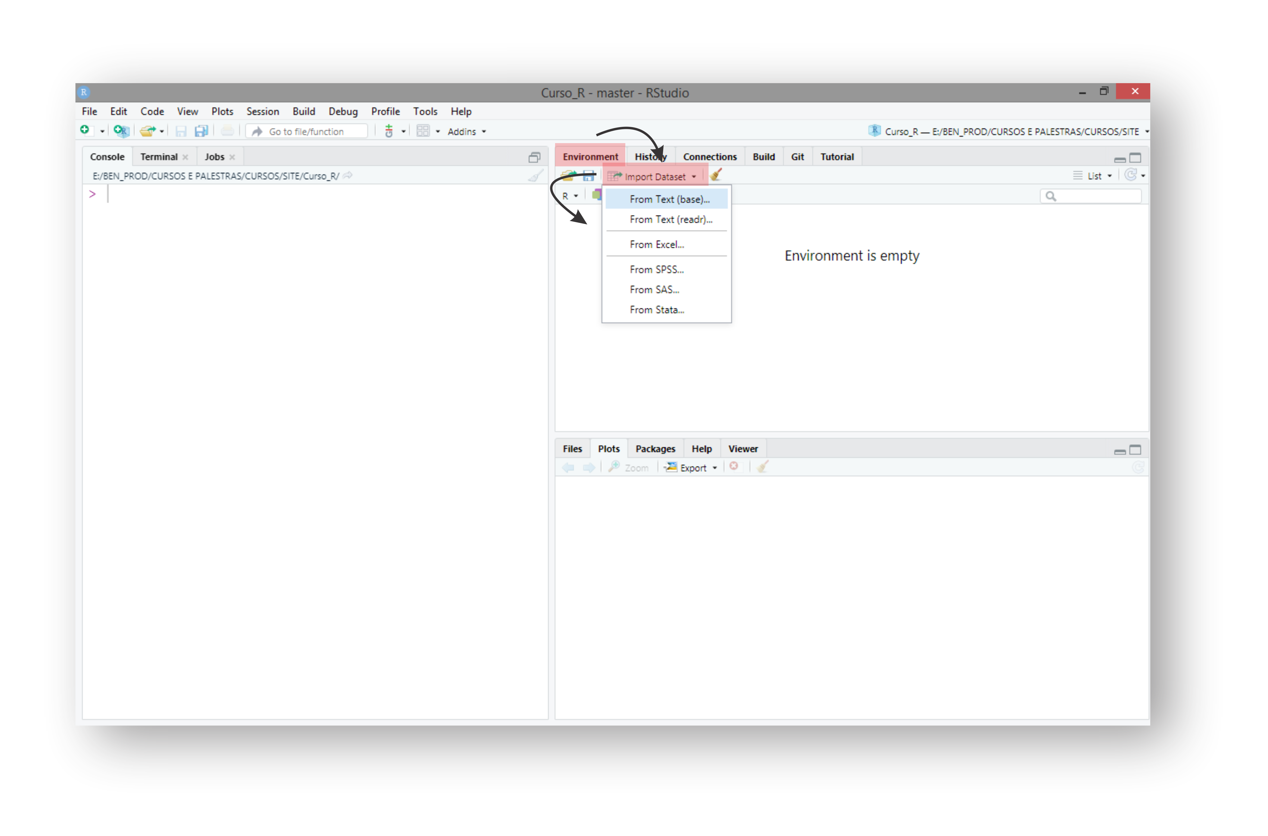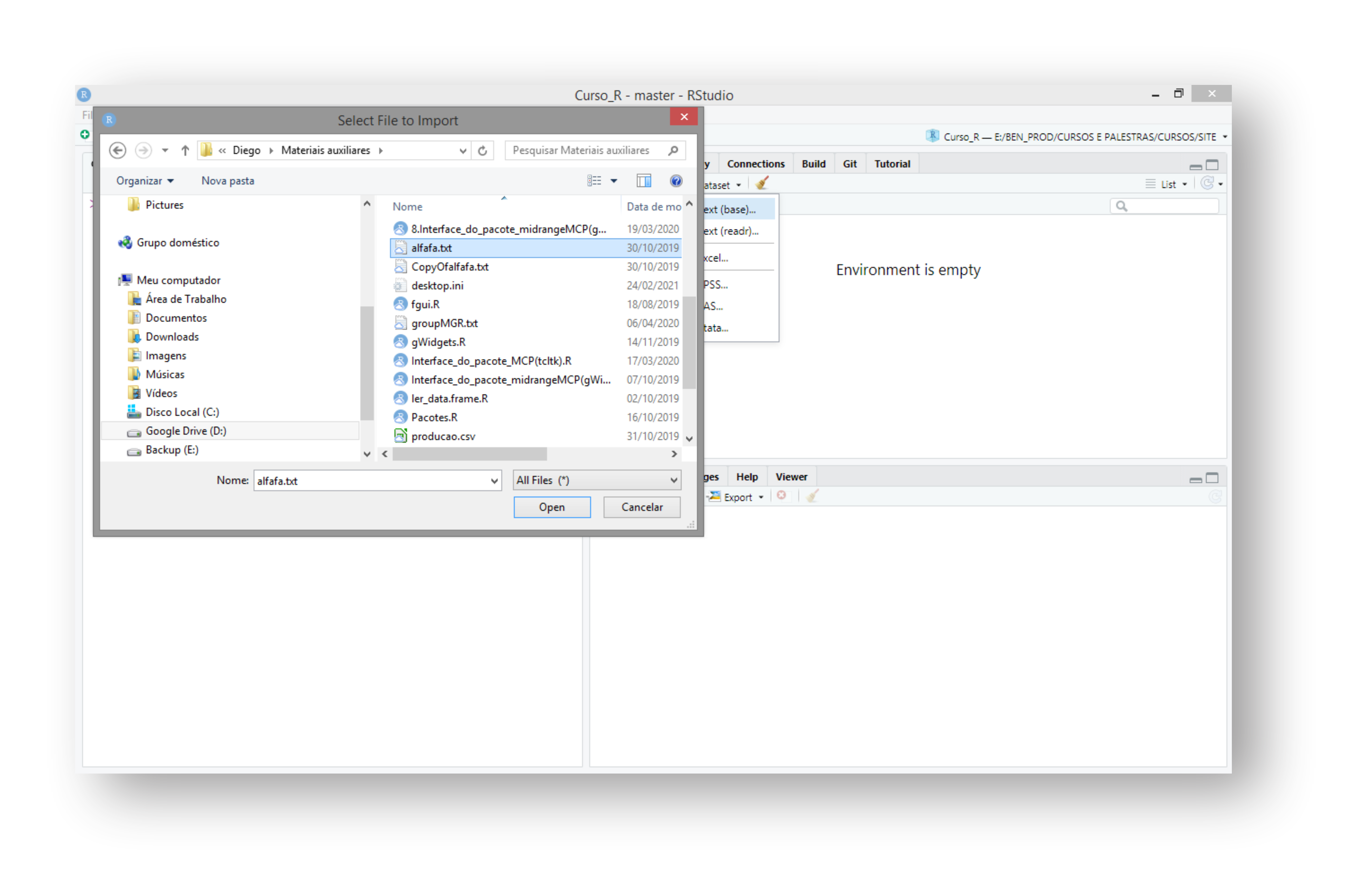 <>.txt, <>.csv;<>.xls, <>.xlsx;R…read.table()data.frame com os dados importadosRStudio tem alguns recursos que podem facilitar a importação de dadosNo banco de dados, sempre: