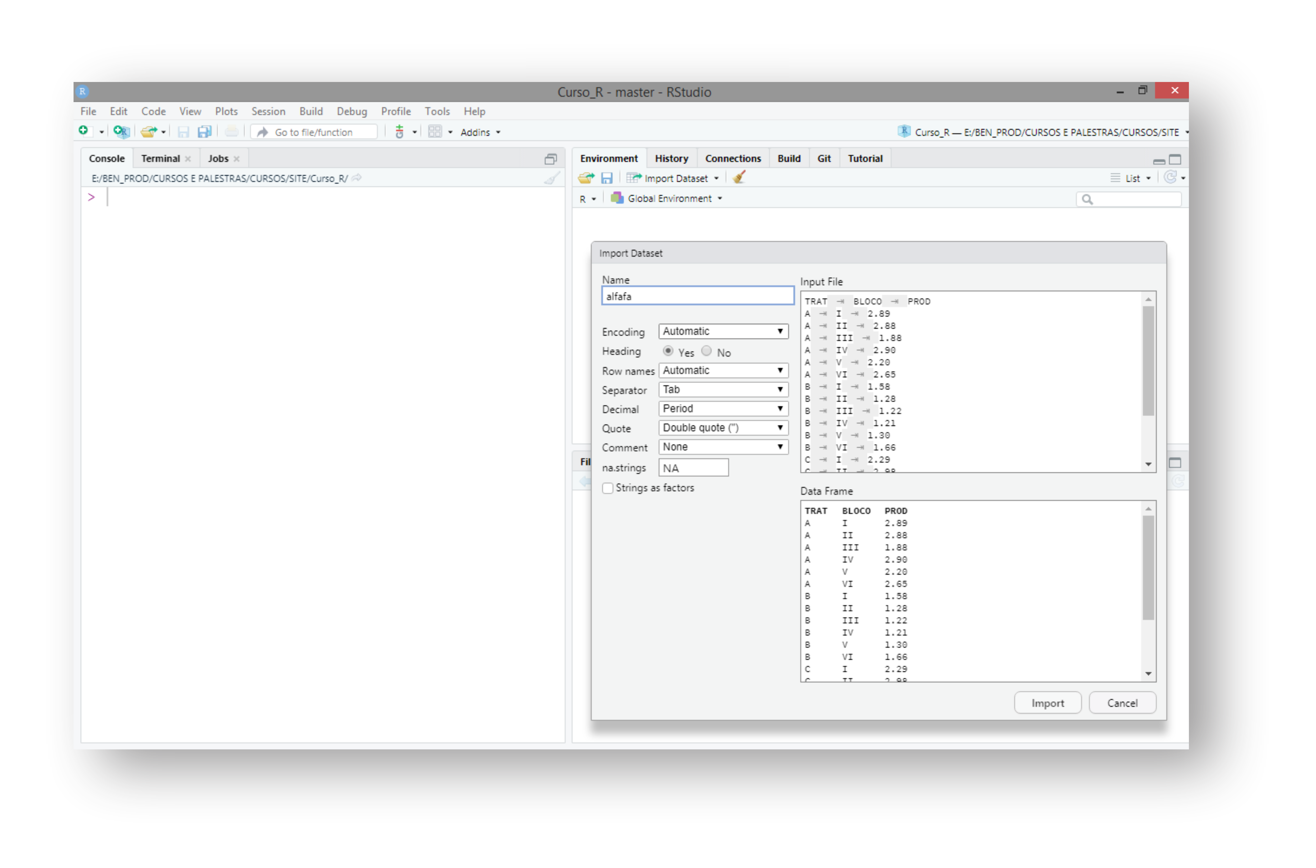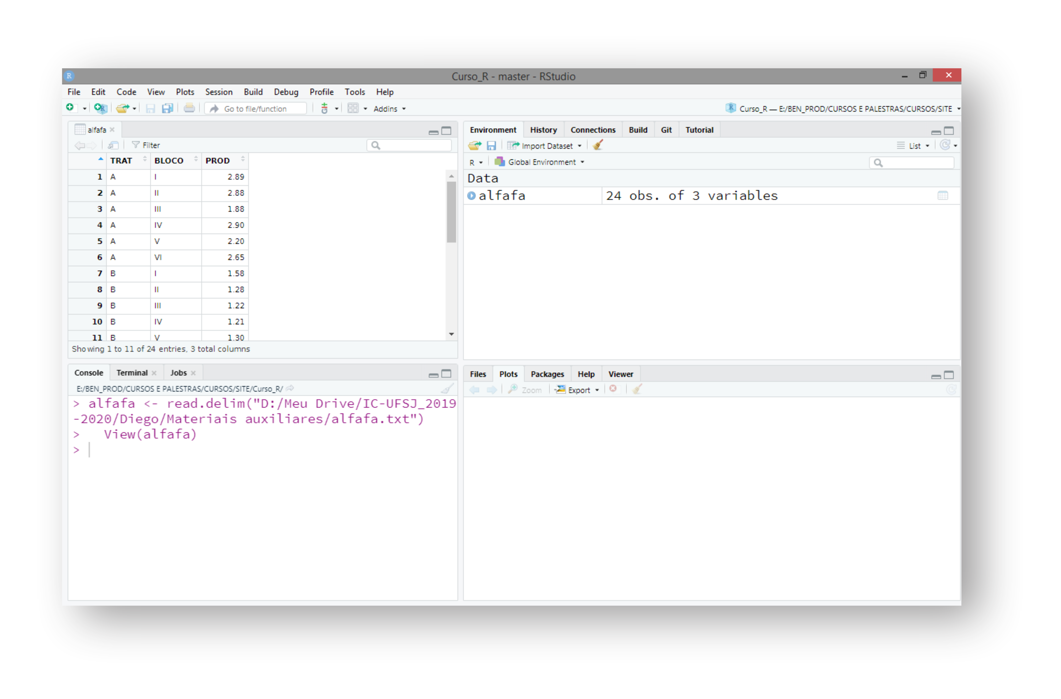 dados1 <- read.table(file = 'C:/eambr01/alfafa.txt', header = TRUE)
